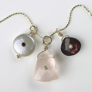 Swami's Cluster. Rose Quartz with White Topaz, Garnet with White Topaz and Freshwater Pearl with Garnet 14kt Gold chain - 18" long